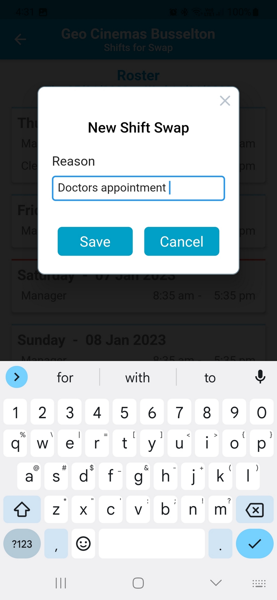 You can view and create time off requests. Can't do one of your shifts? You can request the shift is swapped to someone else. See a shift that someone else can't do? You can let your work know that you are happy to take that shift.